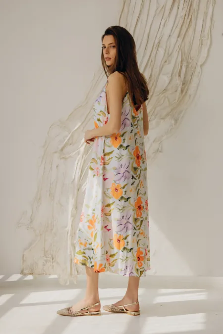 Đul haljina, izrađena od najfinije mešavine lana i viskoze. Duga i raskošna, udobna i prijatna za kožu. Prirodno pada, a onda se od pojasa širi kao ruža, ističe ženstvene obline, a pojasom dodatno oblikuje i naglašava struk. Za nju je korišćeno 6 metara materijala, pa je zamišljena da se nosi kao raskošna haljina za posebne prilike (kao što je venčanje, krštenje, neka bitna proslava), ali i kao letnja haljina za svaki dan, kada zelimo da budemo lepe i osećamo se prijatno, sa malo truda.