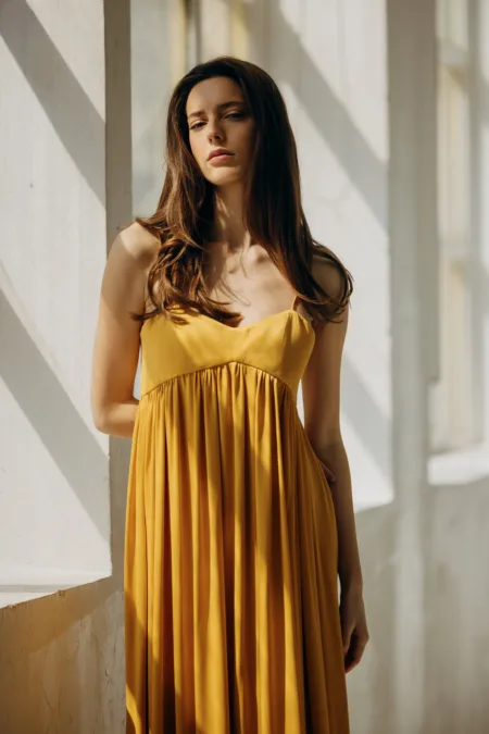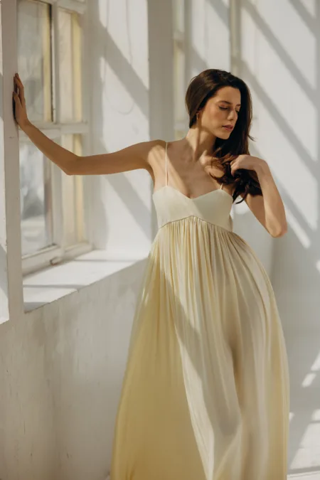 Haljina 𝘙𝘰𝘴𝘢, presečena ispod grudi, sa finim padom i bočnim šlicem.