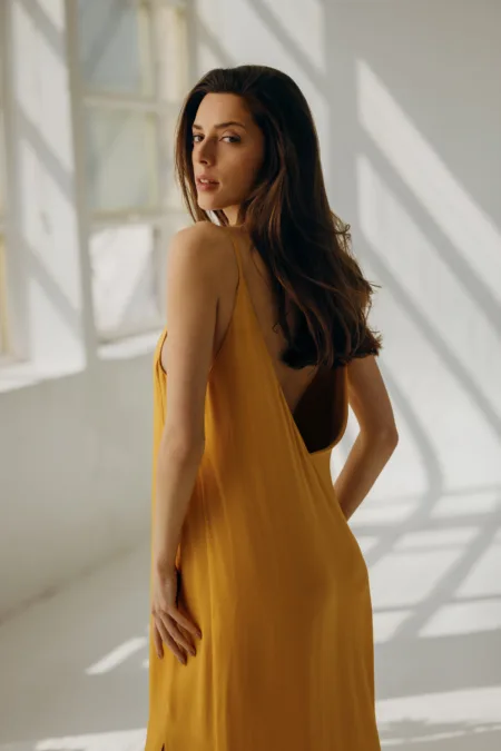 Kaftan haljina, zamišljena tako da stoji svima, i da svima istakne figuru i napravi struk. Može se nositi na dva načina, tako što se u unutrašnosti haljine vezati oko struka, ili pustiti da slobodno pada, pa je samim tim pogodna za razne prilike, od onih svečanijih, do onih opuštenih, dnevnih, kada želimo da nas ništa ne steže, ne ograničava, a da se ipak osetimo posebno i doterano. Krasi je vez ručne izrade u istoj boji kao i tkanina od koje je napravljena. Izrađena je od 100% liocela, prirodnog vlakna biljnog porekla koje se dobija od pulpe eukaliptusa kroz potpuno ekološki proces, te spada u održivije materijale nove generacije. Takođe ga zovu zelena svila. Pogodan je za nošenje tokom cele godine, a leti imamo osećaj da hladi kožu.